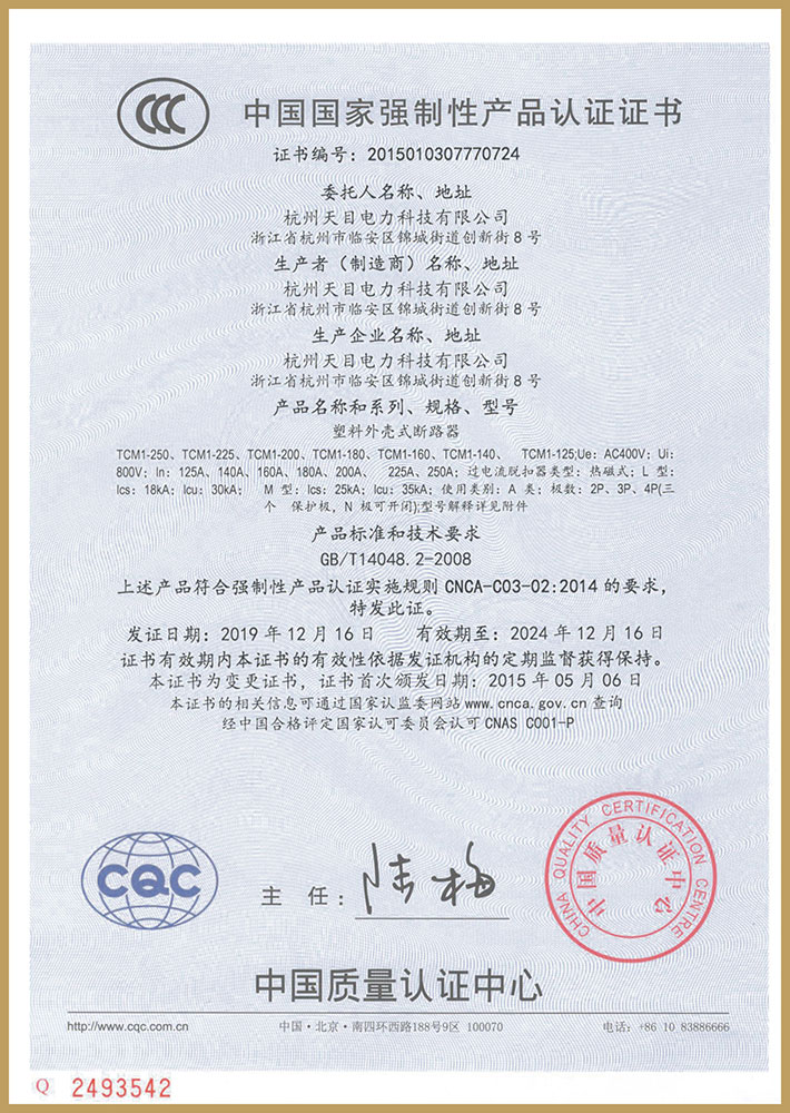 TCM1-250、TCM1-225、TCM1-200、TCM1-180、TCM1-160、TCM1-140、TCM1-125塑料外殼式斷路器 認證證書