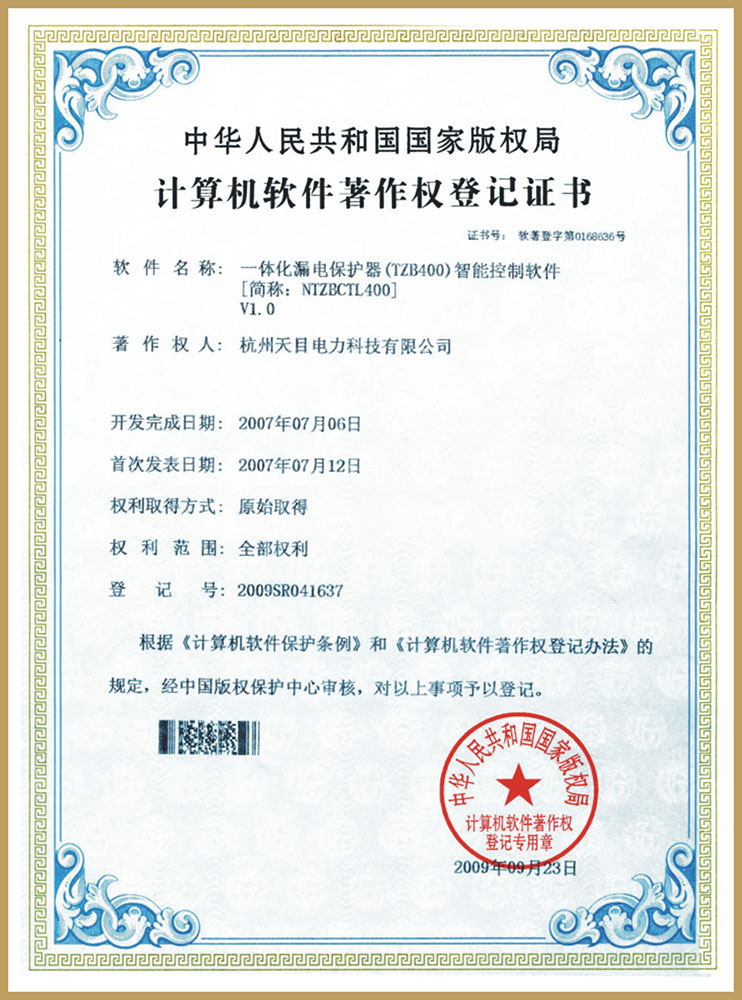 一體化漏電保護器(TZB400)智能控制軟件v1.0 計算機軟件著作權登記證書