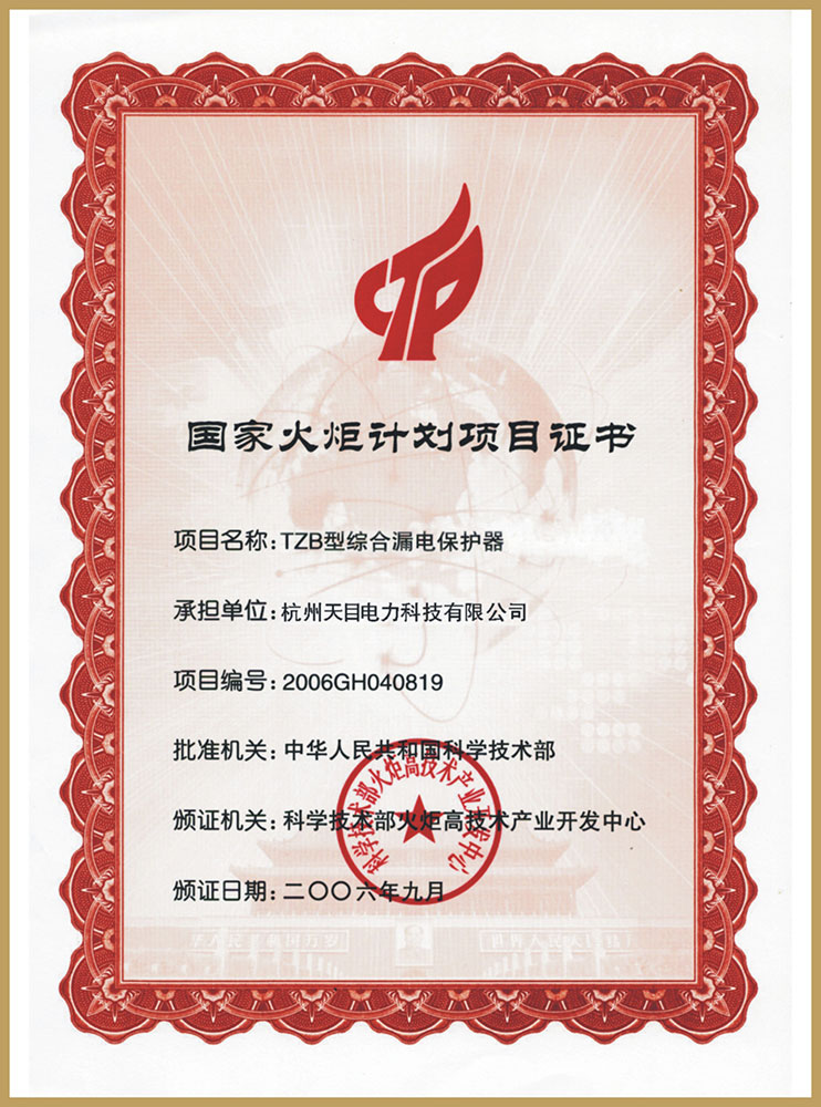 TZB型綜合漏電保護(hù)器 國(guó)家火炬計(jì)劃項(xiàng)目證書